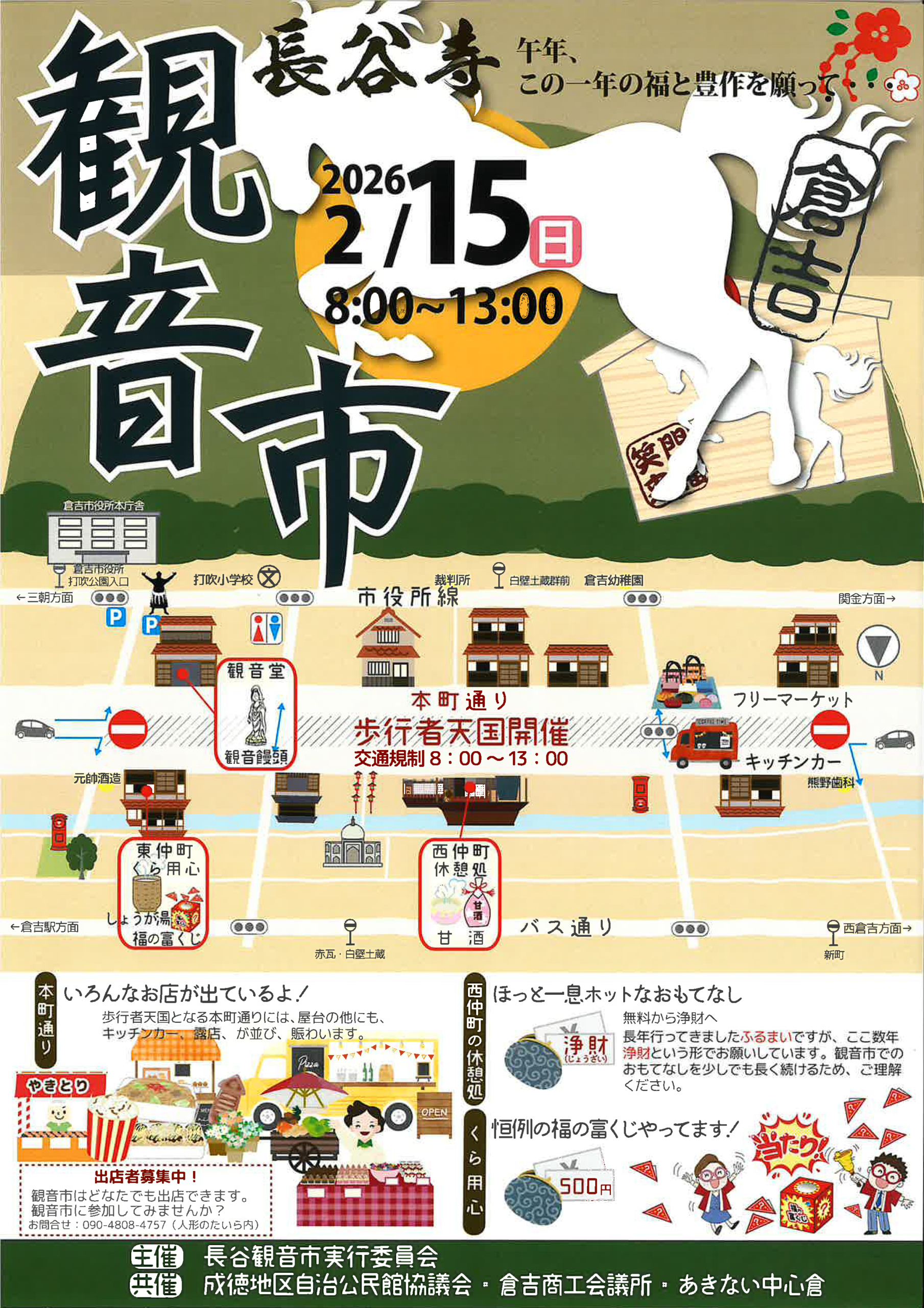 牛玉授けの翌朝には、「長谷の観音市」が開催。本町通りを歩行者天国に、露店で賑わう昔ながらの市が楽しめます。