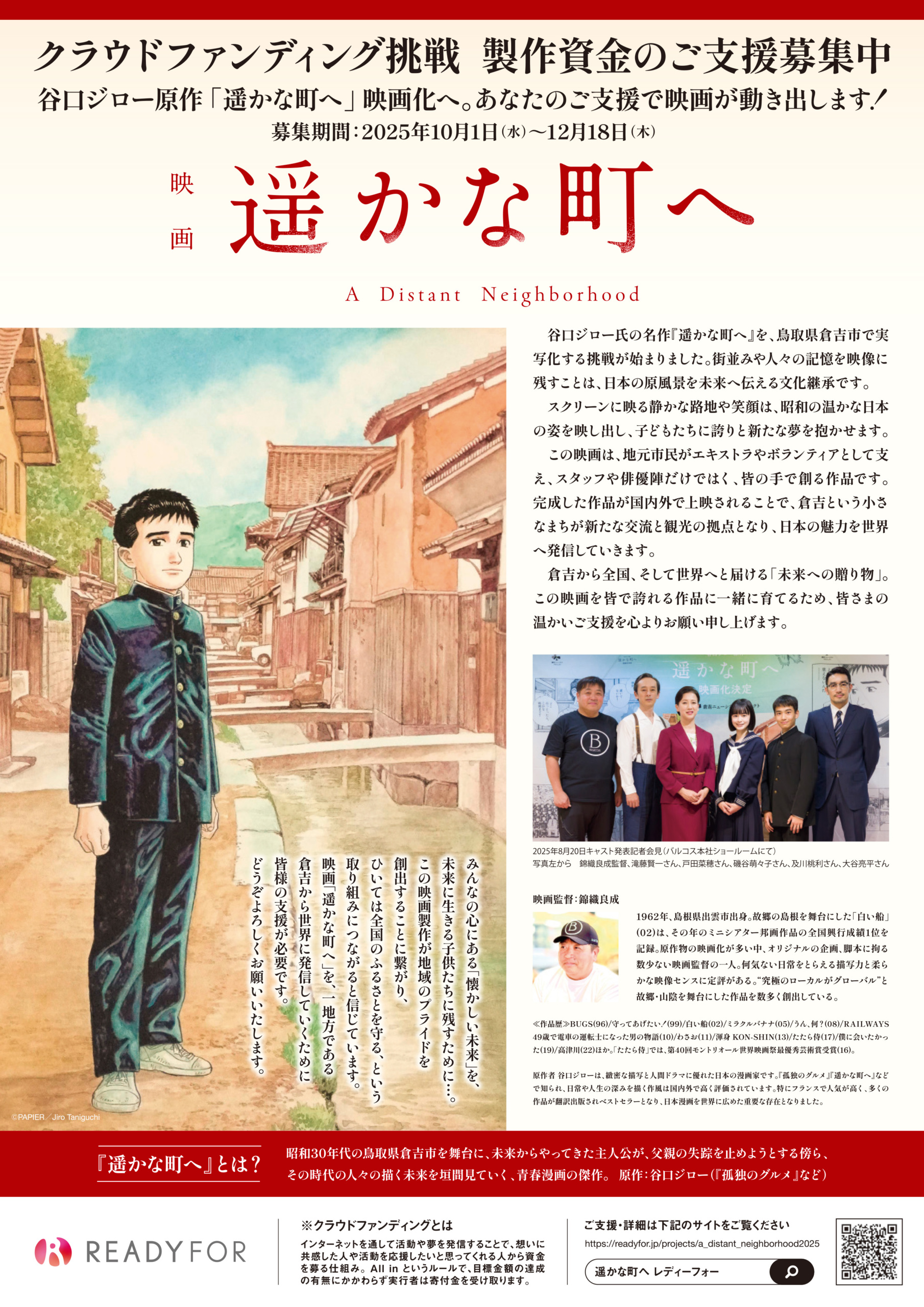 倉吉市を舞台とした谷口ジローさんの漫画『遥かな町へ』の映画化を支援するクラウドファンディングが2025年10月1日よりスタートしました。