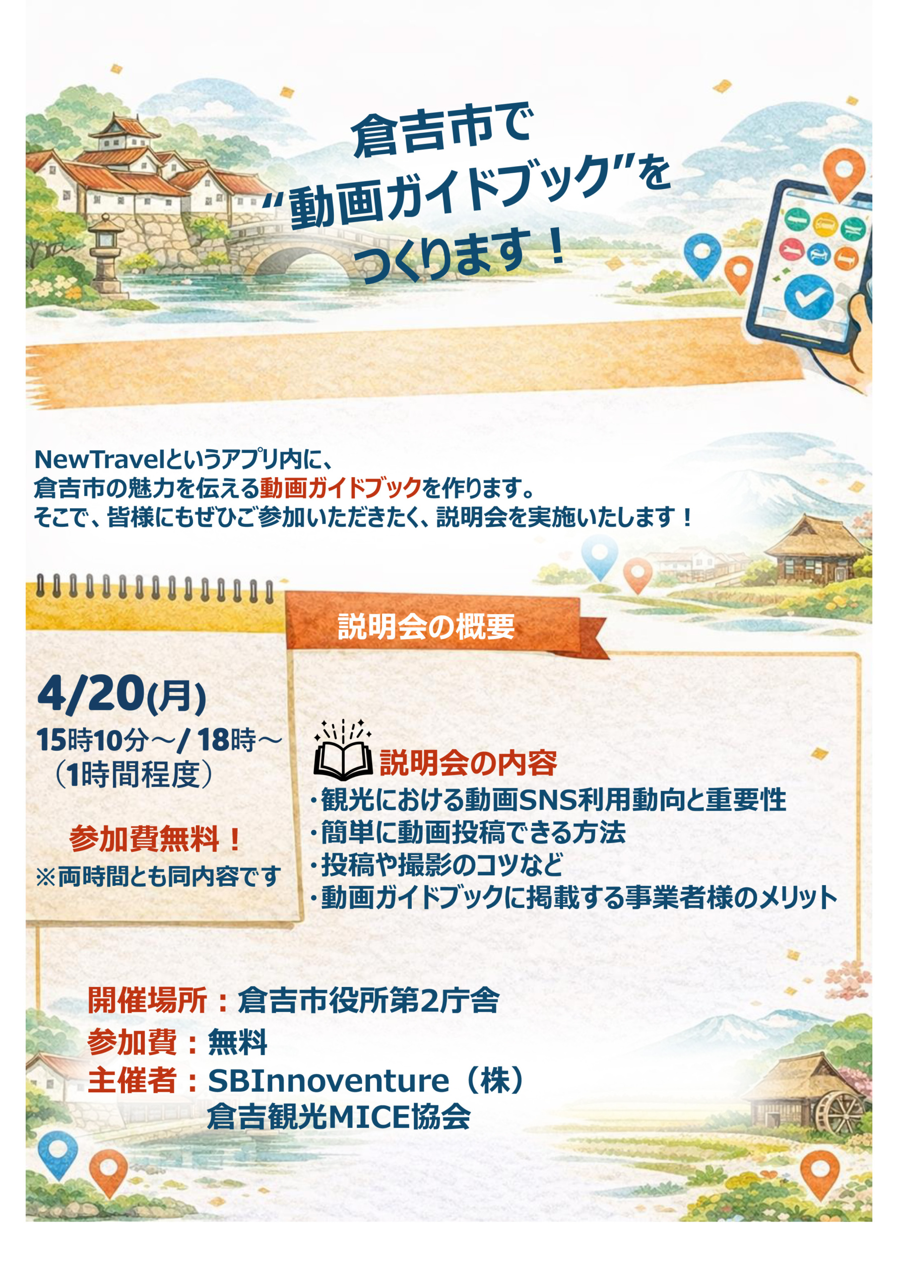 【倉吉市内のお店・施設スタッフの皆様へ】倉吉市動画ガイドブック説明会開催(4/20)