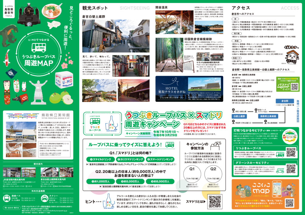 鳥取県立美術館、白壁土蔵群、円形劇場くらよしフィギュアミュージアムなどの主要な観光スポットや観光駐車場をぐるりと周る『うつぶきループバス』が土日祝日に運行します。