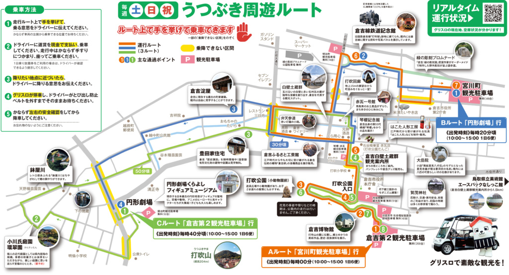 鳥取県立美術館、白壁土蔵群、円形劇場くらよしフィギュアミュージアムなどの主要な観光スポットや観光駐車場をぐるりと周る『うつぶきループバス』も土日祝日に運行中!